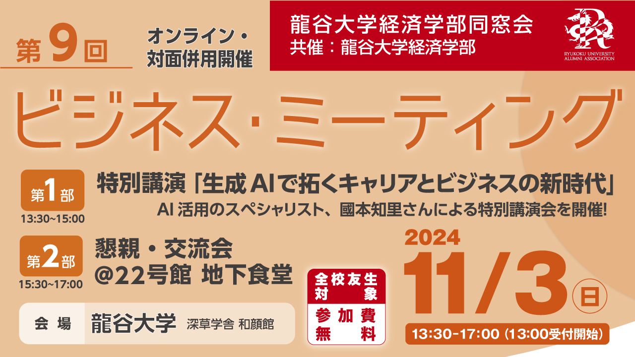 龍谷大学経済学部同窓会主催の2024年度第9回ビジネス・ミーティングの申込フォームです。