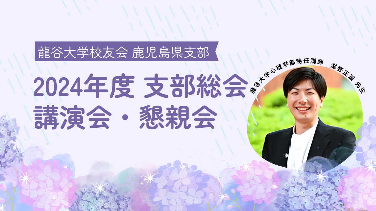 | 17:00~18:00 | 講演会 テーマ「ボランティア自粛論を超えて、私たちは何ができるのか。 〜心のつながりを探究し、社会に力を生み出す心理学部の学びと龍大生の活躍〜」 講師:滋野 正道 先生 (心理学部特任講師、2017年龍谷大学政策学研究科修了) |