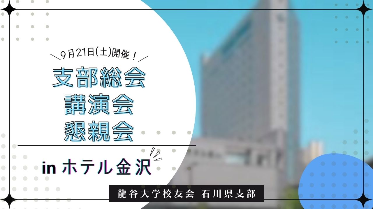 2024年9月21日(土)開催 石川県支部「支部総会・講演会・懇親会」 2024 9/21 2024.09.21 ○開催日 2024年(令和6年)9月21日(土) ○場 所 ホテル金沢 〒920-0849 石川県金沢市堀川新町1番1号 スケジュール 調整中です。内容が決定次第更新いたします。 石川県支部:https://ryukoku-koyukai.jp/branch/石川県 支部からのご連絡 イベント情報 支部からのご連絡 URL Copied!