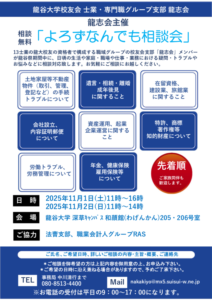 2025年11月1日(土)-2日(日)開催 龍志会「よろずなんでも相談会」