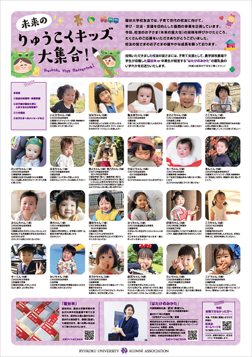 校友会報にお子さまの写真を投稿してみませんか。投稿いただいた方には、子育て支援(食の支援)の一環として、龍谷大学農学部の学生が実習農場で収穫した龍谷米か、乳幼児は卒業生が経営する企業(株式会社はたけのみかた)の離乳食をもれなくお送りいたします。